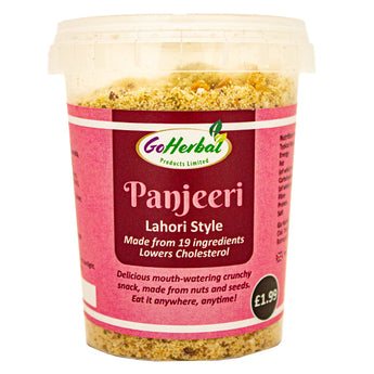 Go Herbal Panjeeri 100g, prepared in the traditional Lahori style with 19 natural ingredients, supports heart health by helping to lower cholesterol levels. This carefully crafted blend combines herbs and nutrients to promote overall wellness and balance, making it a beneficial addition to your daily routine. Ideal for those seeking a natural approach to managing cholesterol and enhancing vitality.