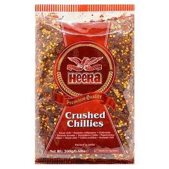 Heera Crushed Chillies (200g), the most common type of dried chilli, these flakes add a flavouring of spice to any dish, used in moderation it adds a lovely red glow and a sharp hot heat. It adds a wonderful spicy touch to tomato-based sauces and curries.