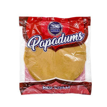 Heera Red Chilli Papadums (200g) - Chilli flavoured round poppadoms ready to fry. Excellent as part of a side dish, even tastier with dips, chutneys and curries.