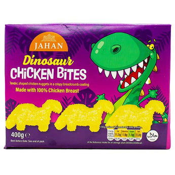 Jahan Dinosaur Chicken Bites (400g). Tender, dinosaur-shaped chicken nuggets in a cripsy breadcrumb coating.